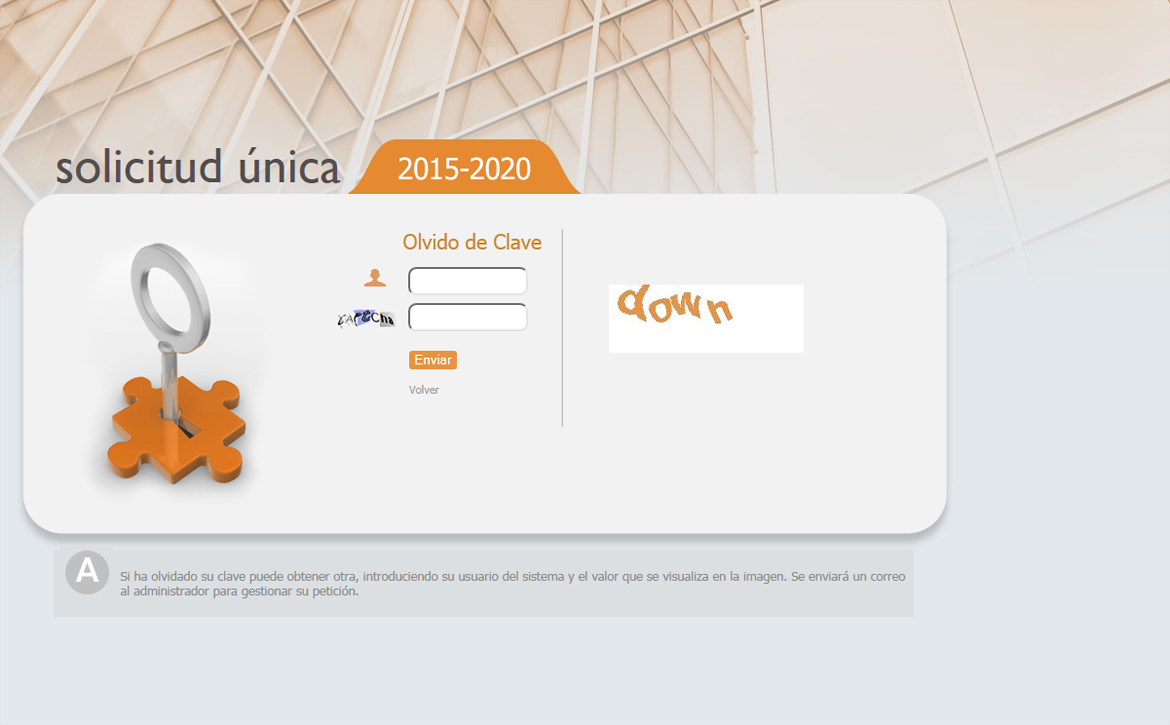 A continuación, rellene los campos de usuario y código CAPTCHA. En la segunda casilla escriba las letras que aparecen en la imagen de la derecha. Después pulse el botón . Recibirá un email con la nueva contraseña cuando se haya gestionado su petición.